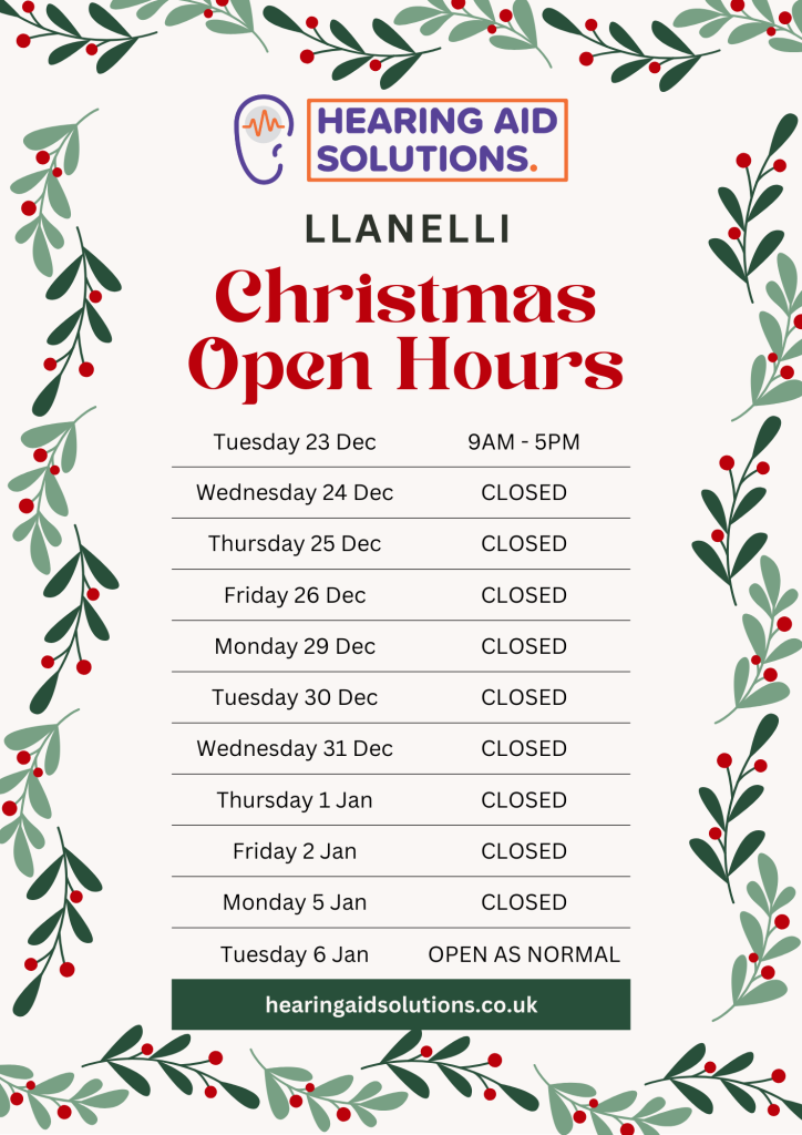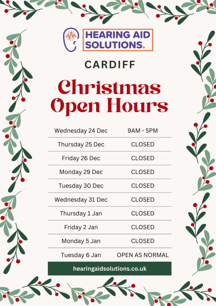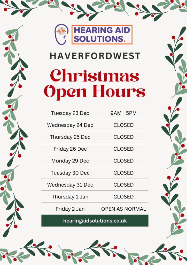 Christmas Opening Hours 2025 / Uncategorized / By HAS2024 Please find our Christmas opening hours for each of our four clinics in the images below. Carmarthen Carmarthen Opening Hours Cardiff Cardiff Opening Hours Haverfordwest Haverfordwest Opening Hours Llanelli Llanelli Opening Hours From everyone at Hearing Aid Solutions, we wish you a Merry Christmas!